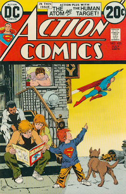 I have a hard time believing Nick Cardy drew this cover because of how bad it is. At a quick glance it has a fun theme, but it doesn't even mention the stories inside besides the main characters. The kids sitting in the stoop are all a little creepy looking. The dog is accidentally standing on the boys foot. Shadows don't line up. The whole right side is just blank yellow which makes no sense because the left side shows a crowded inner city.